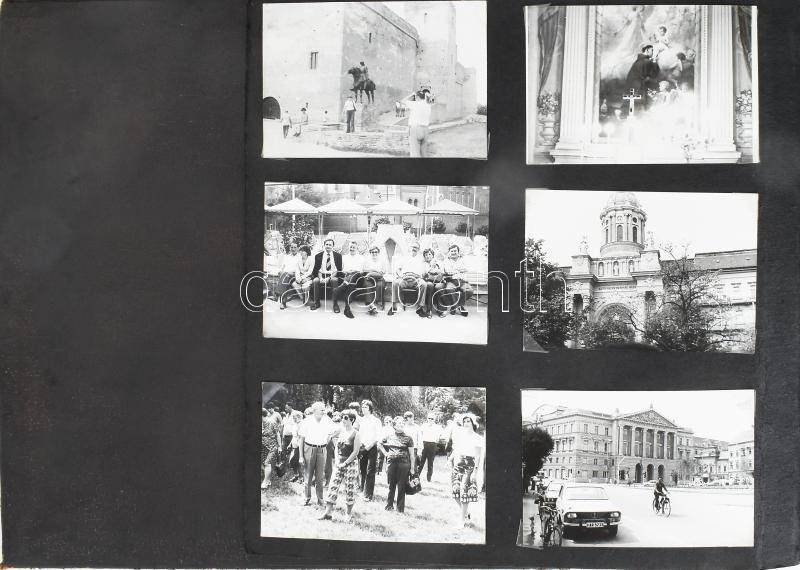 cca 1980 Kelet-európai kirándulás albuma (Románia, Bulgária), benne fotók, képeslapok, térképek, naplószerű feljegyzések. Tartalmas anyag, bőrkötésű albumban, kissé sérült, kopott borítóval, 28x24,5x5,5 cm