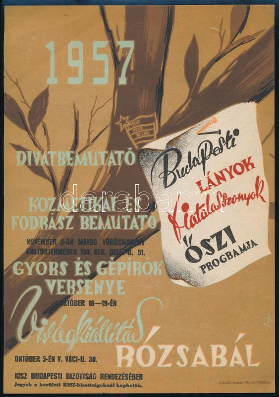 https://www.darabanth.com/en/459-Online-auction/459.0/Art-and-other-collectibles/Posters~2000014/1957-Budapesti-lanyok-fiatalasszonyok-oszi-programja-kisplakat-24x16-5-cm~II3073681