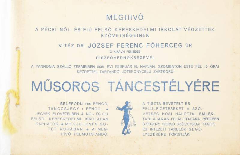 1938 Meghívó a Pécsi Női- és Fiú Felső Kereskedelmi Iskolát Végzettek ... https://www.darabanth.com/en/459-Online-auction/459.0/Art-and-other-collectibles/Printed-Materials~2000036/1938-Meghivo-a-Pecsi-Noi-es-Fiu-Felso-Kereskedelmi-Iskolat-Vegzettek-Szovetsegei-altal-rendezett~II3077154