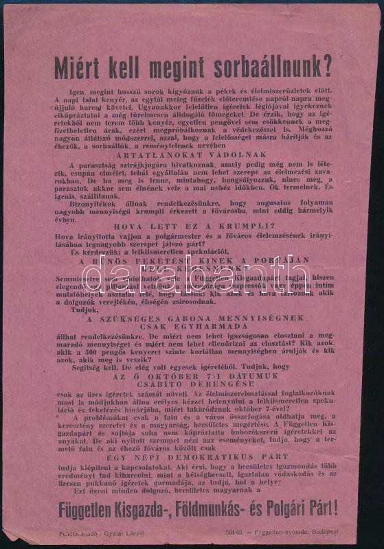 cca 1945 "Miért kell megint sorbaállnunk?", a Független Kisgazda-, Földmunkás- és Polgári Párt (FKgP) röplapja, 21x14 cm