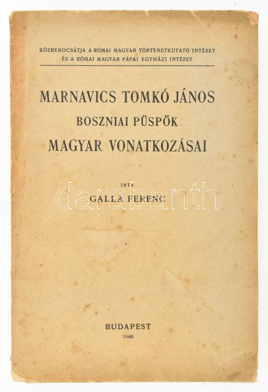 Galla Ferenc: Marnavics Tomkó János boszniai püspök magyar vonatkozása... https://www.darabanth.com/en/459-Online-auction/459.0/Books/Books-History~2000020/Galla-Ferenc-Marnavics-Tomko-Janos-boszniai-puspok-magyar-vonatkozasai-Kozrebocsatja-a-Romai~II3073089