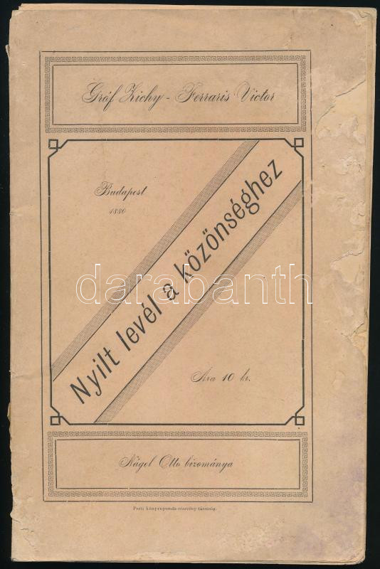 Gróf Zichy-Ferraris Victor: Nyilt levél a közönséghez. Bp., 1880, Nágel Ottó (Pesti Könyvnyomda Rt.), 96 p. Kiadói papírkötés, sérült, kissé hiányos borítóval, néhány kissé sérült, a fűzéstől elváló lappal, tulajdonosi bélyegzővel. A szerző gróf zichi és vásonkeöi Zichy-Ferraris Viktor (1842-1880) főnemes, földbirtokos, országgyűlési képviselő, Pest-Pilis-Solt vármegye főispánja (1871-1873), belügyi államtitkár (1878-1879). Politikai szerepvállalása mellett közgazdasági ügyekkel foglalkozott, részt vett több pénzintézet alapításában. Emiatt számos támadás érte a sajtó részéről, a Magyarország c. lap főmunkatársa, Asbóth János vezetésével, aki azzal gyanúsította, hogy a pénzintézetek érdekében lobbizott bizonyos összegekért cserébe. Ezekre a vádakra reagálva adta ki jelen írását, azonban nem sikerült tisztáznia magát a közvélemény előtt. Előbb lemondott pozícióiról, majd 1880-ban, a Nemzeti Casinóból való kizárást követően pisztolypárbajt vívott a kizárást kezdeményező Károlyi István gróffal, ahol súlyos sérülést szerzett, majd pár nappal később elhunyt.
