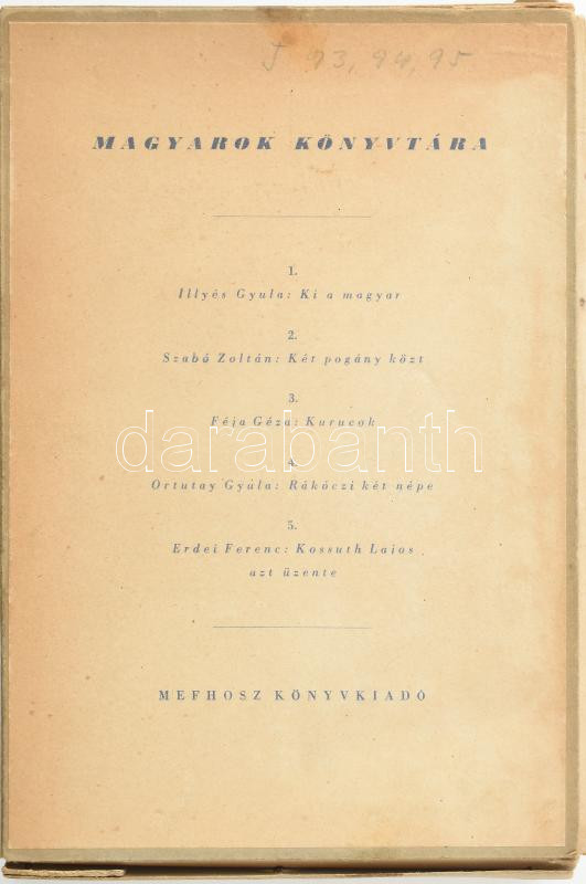Description: Magyarok Könyvtára, 1-5. kötet (teljes): Illyés Gyula: Ki a magyar?; Szabó Zoltán: Két pogány közt.; Féja Géza: Kurucok.; Ortutay Gyula: Rákóczi két népe.; Erdei Ferenc: Kossuth Lajos azt üzente. (Bp., 1939), MEFHOSZ. Kiaódói papírkötés, változó (nagyrészt jó) állapotban, kissé sérült kiadói karton tékában.
