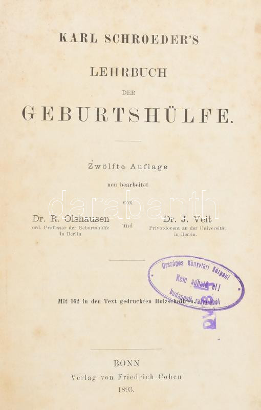 Karl Schroeder's Lehrbuch der Geburtshülfe. Zwölfte Auflage neu bearbeitet von Dr. R. Olshausen und Dr. J. Veit. Bonn, 1893, Friedrich Cohen, XI+(1)+925+(1) p. Szövegközi illusztrációkkal. Német nyelven. Korabeli, aranyozott gerincű félbőr-kötésben, márványozott lapélekkel, kissé sérült, kopottas borítóval és gerinccel, helyenként kissé foltos lapokkal, volt könyvtári példány.