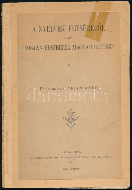 Dr. Lászlófalvi Velics Antal: A nyelvek egységéről vagy: hogyan beszél... https://www.darabanth.com/en/459-Online-auction/459.0/Books/Books-Social-sciences~2000027/Dr-Laszlofalvi-Velics-Antal-A-nyelvek-egysegerol-vagy-hogyan-beszeltek-magyar-eleink-Bp-~II3075778