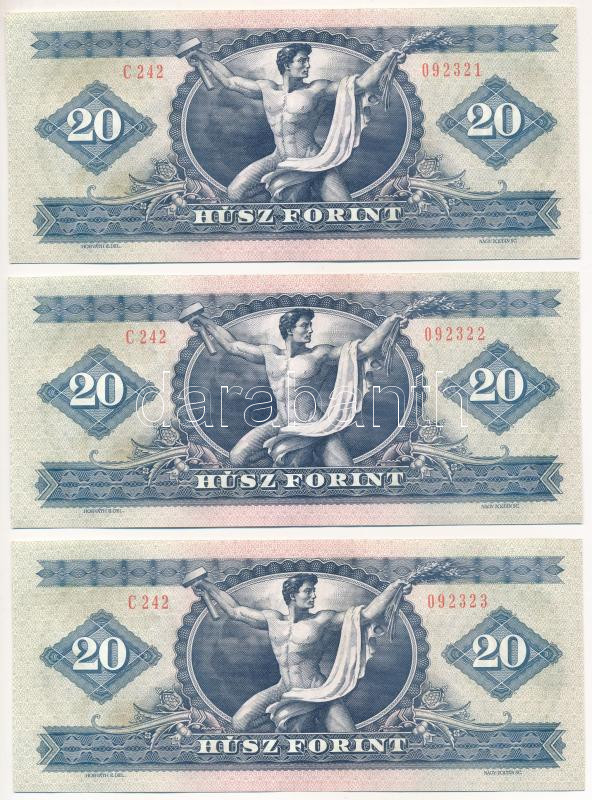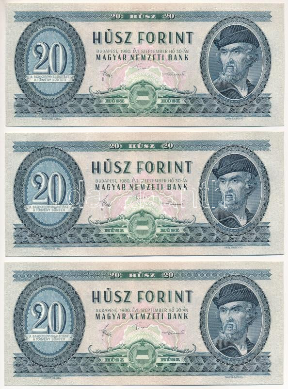 1980. 20Ft (3x) sorszámkövetők "C 242 092321 - C 242 092323" T:AU Hungary 1980. 20 Forint (3x) consecutive serials "C 242 092321 - C 242 092323" C:AU Adamo F17