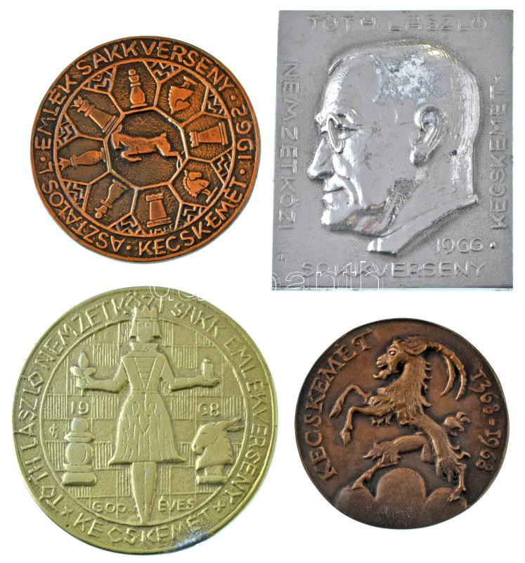 1962. "Asztalos L. Emlék Sakkverseny - Kecskemét 1962" egyoldalas fém emlékérem (91mm) + 1966. "Tóth László Nemzetközi Sakkverseny Kecskemét - 1966" fém plakett (110x92mm) + 1968. "Kecskemét 1368-1968" egyoldalas, bronz emlékérem hátoldalán "COPIA" beütéssel (81mm) + "Tóth László Nemzetközi Sakk Emlékverseny - 600 éves Kecskemét" egyoldalas Al emlékérem (103mm) T:XF