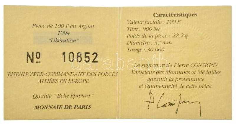 Franciaország 1994. 100Fr Ag "Dwight David Eisenhower" dísztokban, tan... https://www.darabanth.com/en/459-Online-auction/459.0/Numismatics/Worldwide-silver-and-metal-coins~500015/Franciaorszag-1994-100Fr-Ag-Dwight-David-Eisenhower-disztokban-tanusitvannyal-T-PPFrance-1994~II3070957