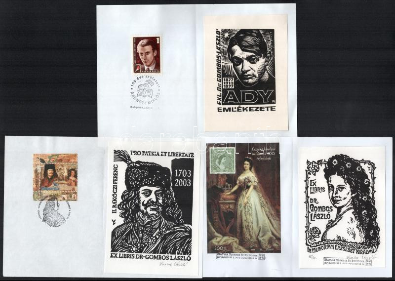 Írók, költők 7 db halmozott grafika: ex libris, bélyeg, bélyegzés azonos témában. közötte József Attila, Ady, stb kb 20x14 cm