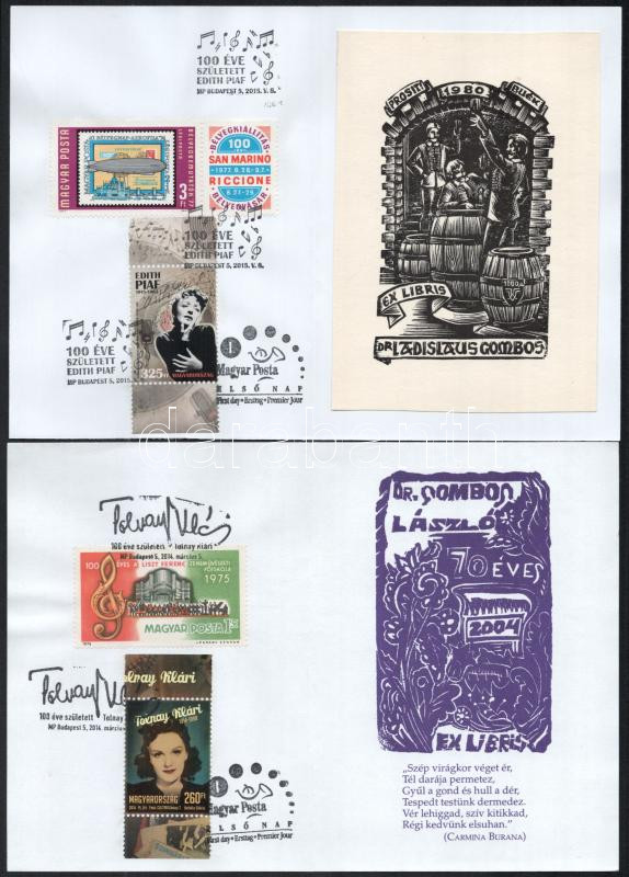 Zenészek, zene 5 db halmozott grafika: ex libris, bélyeg, bélyegzés az...