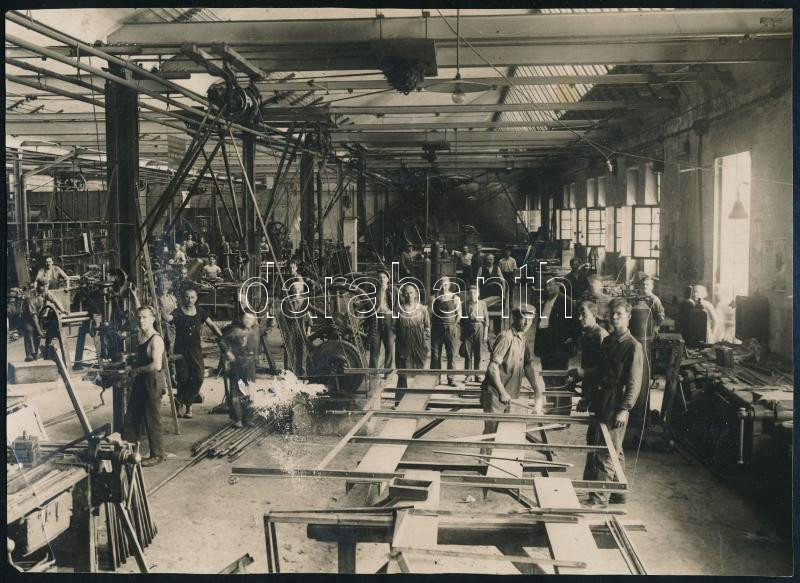 1935 Budapest, Gyömrői út 80., Hutter és Schrantz Rt. műhelybelső, fotó, hátoldalon feliratozva, felületén törésnyomok, 15×21 cm
