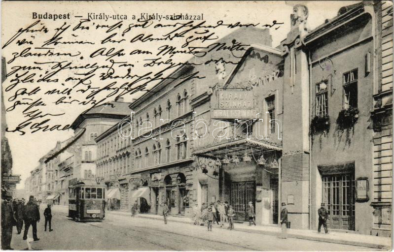 1913 Budapest VII. Király utca, Király színház, cukorka és nyakkendő üzletek, bor- és sörház, villamos (EK)