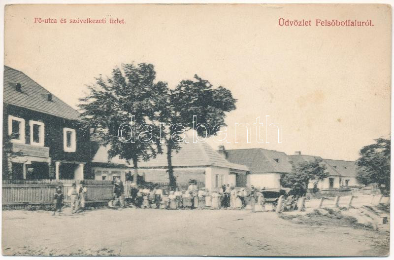 Description: 1918 Felsőbotfalu, Horné Bzince (Botfalu, Russóbotfalu, Bzince pod Javorinou); Fő utca, szövetkezet üzlete és saját kiadása / main street, cooperative shop (Rb)
