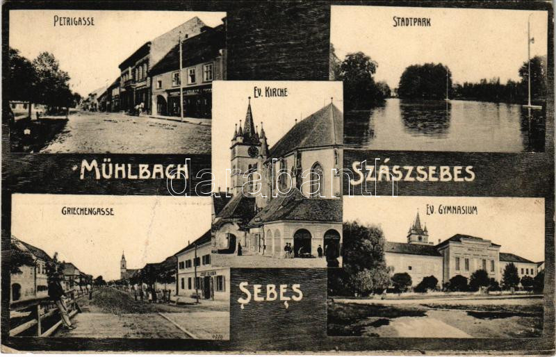 1912 Szászsebes, Mühlbach, Sebesul Sasesc, Sebes; Petrigasse, Apotheke, Stadtpark, Ev. Kirche, Griechengasse, Ev. Gymnasium / Petri utca, gyógyszertár, park, Evangélikus templom és gimnázium, Görög utca, Josef Glaser üzlete. J. Hientz kiadása / street view, pharmacy, park, Lutheran church and grammar school, shops (fa)