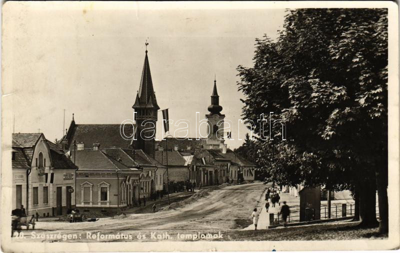 1943 Szászrégen, Reghin; Református és katolikus templomok, szíjgyártó... https://www.darabanth.com/en/459-Online-auction/459.0/Postcards/Transylvania~1500006/1943-Szaszregen-Reghin-Reformatus-es-katolikus-templomok-szijgyarto-szovetkezet-magyar-zaszlok~II3077424