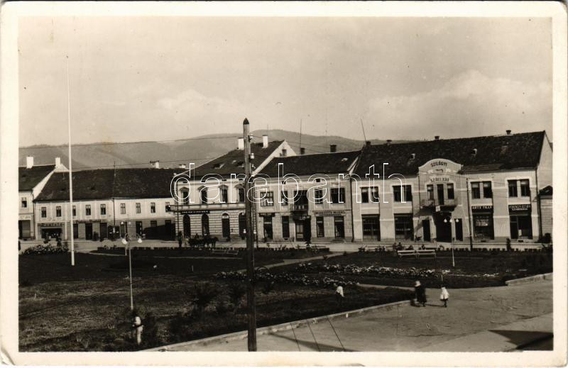 Gyergyószentmiklós, Gheorgheni; Fő tér, Szilágyi szálloda, Artz Tilly, Ferenczy István, Moskovits Mendel, Tőzsér Bálint, Ingber Jenő, Puskás és Romfeld üzlete. Lőrincz István fényképész felvétele / main square, hotel, shops (EK)