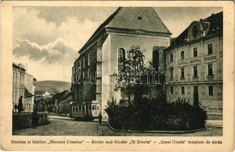 Description: Nagyszeben, Hermannstadt, Sibiu; Biserica si Institut "Maicelor Ursuline" / Kirche und Kloster St. Ursula / Szent Orsolya templom és zárda, villamos / Ursuline church and nunnery, tram (ázott sarok / wet corner)