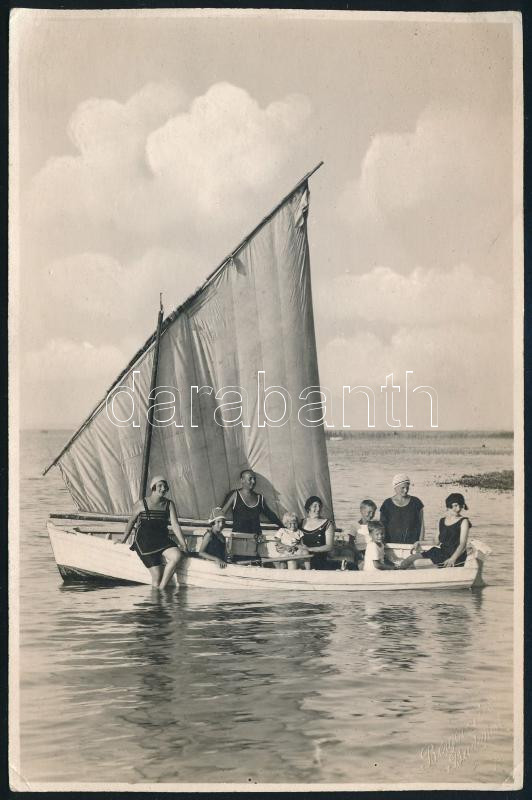 1925 Balatonlelle, sétahajókázás családi körben, fotó, a hátoldalán pecséttel jelzett (Bp., Berger Rezső), dátumozva, a sarkain apó gyűrődésekkel, törésnyomokkal, 17x11 cm