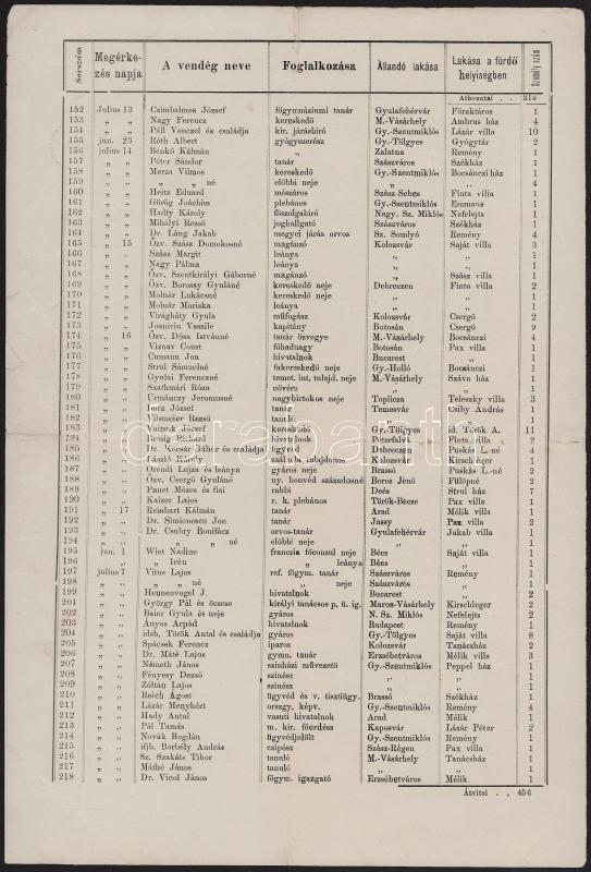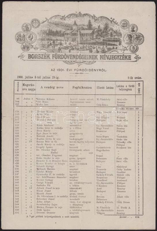 1901 Borszék (Erdély) fürdővendégeinek névjegyzéke az 1901. évi fürdőidényről, kétoldalas lap, elől a a fürdő fametszetes dekoratív képével, hajtott, de jó állapotban
