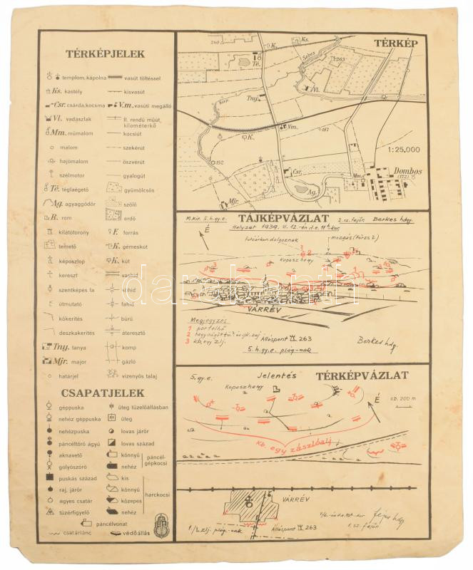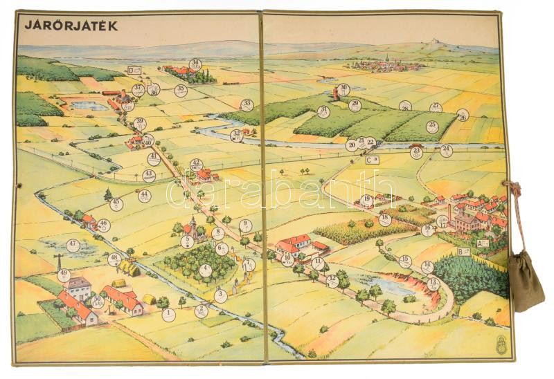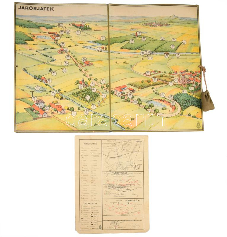 Járőrjáték társasjáték. Budapest, 1940 körül. Középen hajtott karton játékterep. Színes. Nyitva 43×61 cm. + 1 lev.: Játékszabály + vászonzacskóban: 3 db egyszerű fabábú és dobókocka. Helyenként kopásokkal. /// Board game "Járőrjáték" (Patrol Game). Budapest, around 1940. Folding cardboard game board in the center. Colored. Open size: 43 × 61 cm. + 1 sheet: game rules + in a cloth bag: 3 simple wooden pawns and a die. With some wear in places.