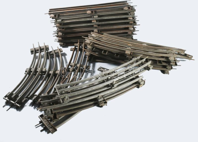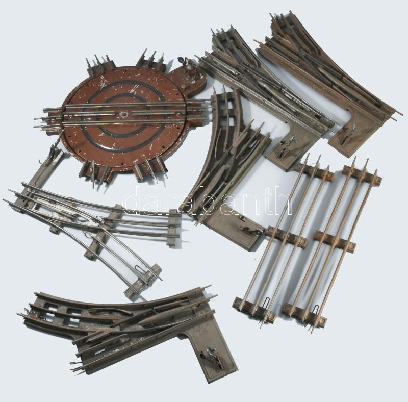 cca 1930 Marklin 41 részes vonatsín készlet fordítókoronggal. Benne egyenes és íves sínek, jobb- és baloldali váltók, fordítókorong és lámpa elem. Teljes pályává összeállítható. Jó állapotú, ritka! /// Approx. 1930 Märklin 41-piece train track set with a turntable. Includes straight and curved tracks, right- and left-hand switches, a turntable, and a signal light. Can be assembled into a complete layout. Good condition, rare!