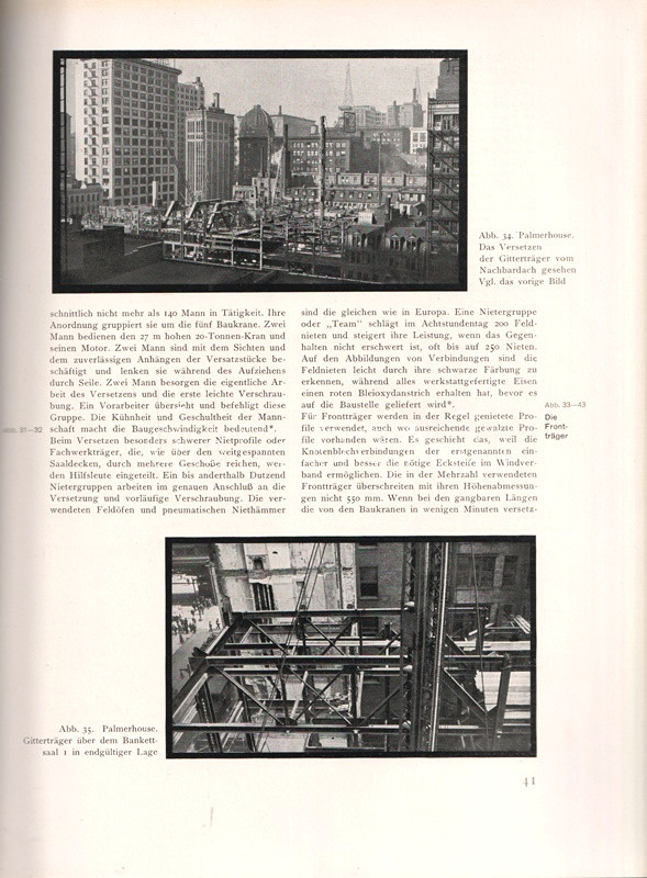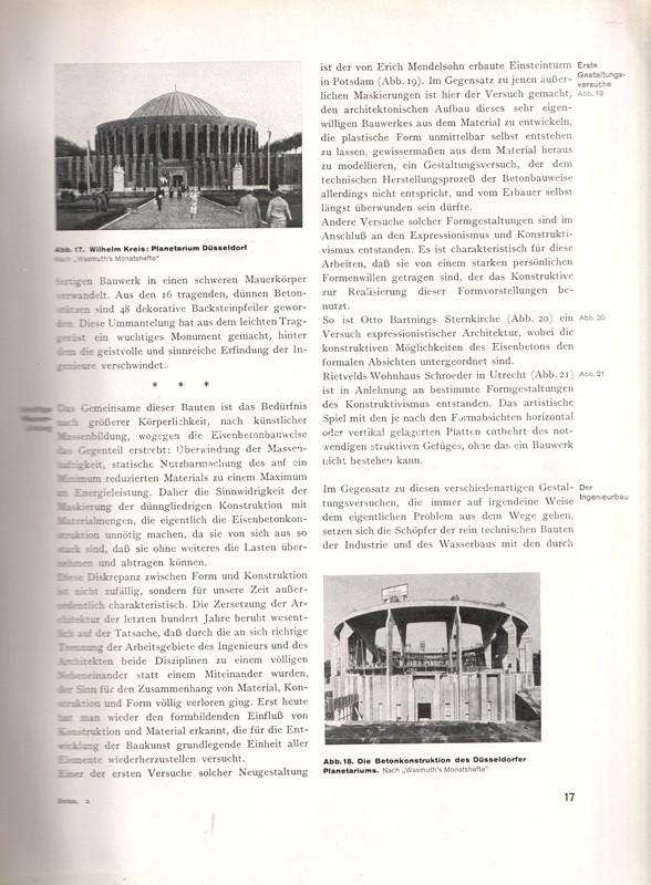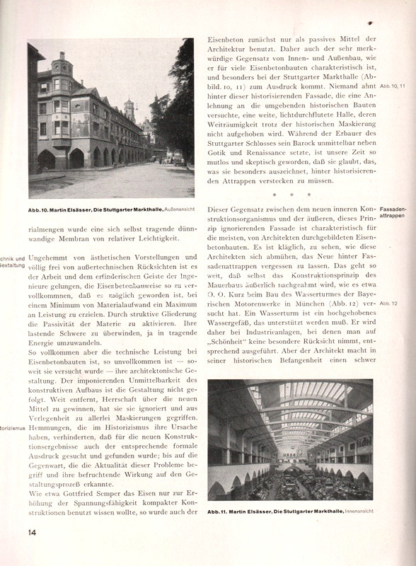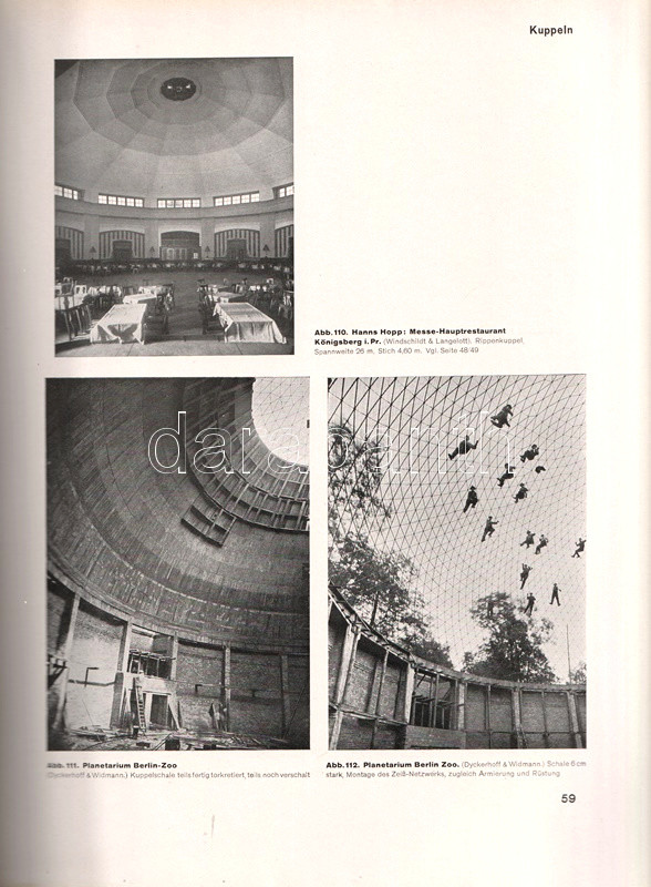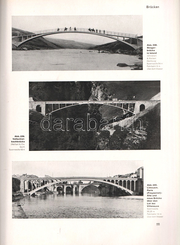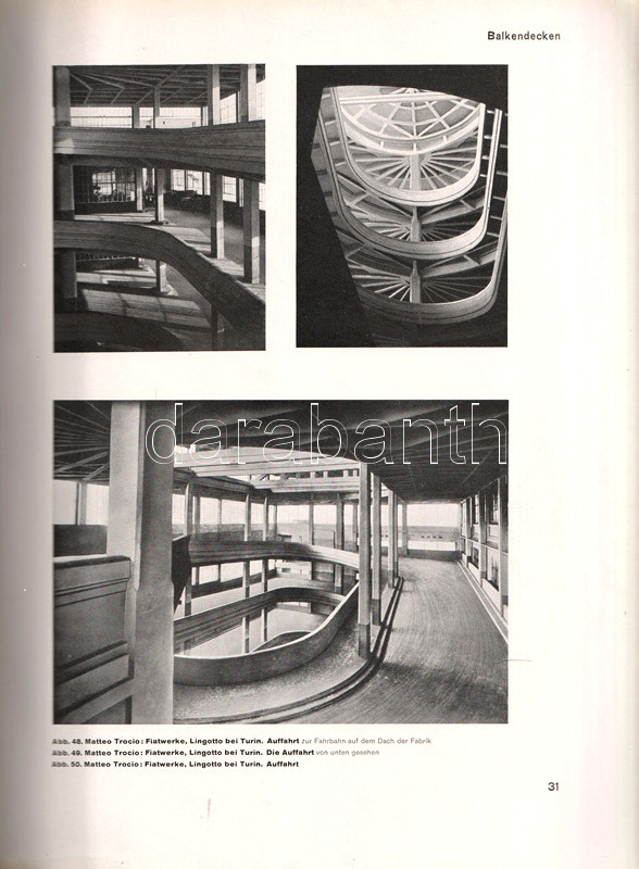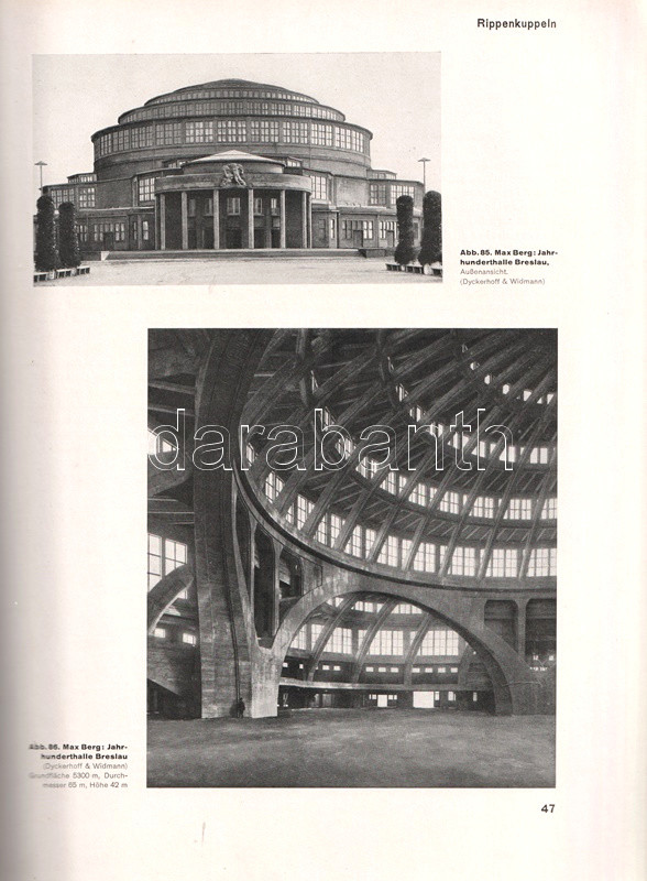 A vasbeton-építészet lehetőségeit bemutató albumunkban főként amerikai és németországi középületek, gyárcsarnokok, kiállítótermek, vásárcsarnokok, uszodák, buszgarázsok beltéri és kültéri szerkezetfotói, magyarázó ábrák kíséretében. A kötet második felében villák, töltőállomások, víz- és hűtőtornyok, völgyzáró gátak és hidak látványos felvételei. A címoldalon régi tulajdonosi bejegyzés.