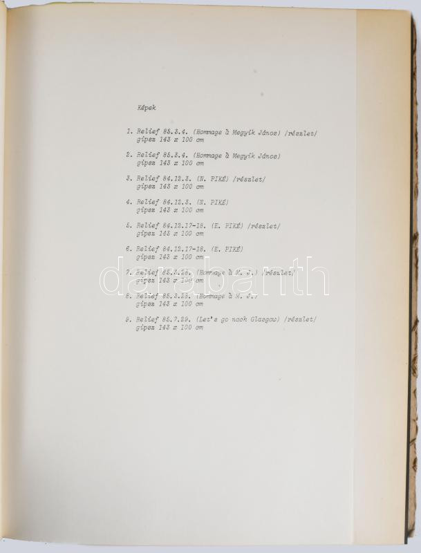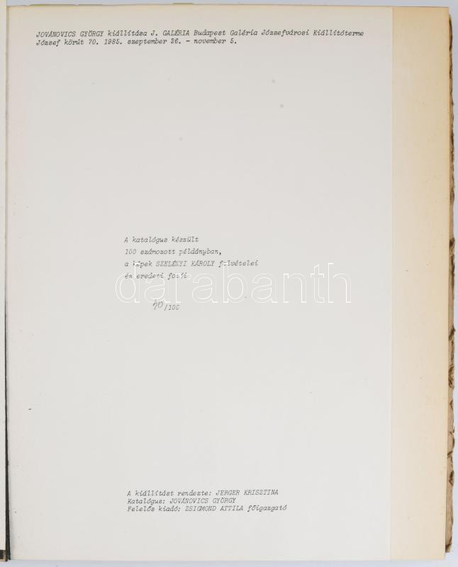 Jovánovics. Jovánovics György kiállítása. Szelényi Károly eredeti fekete-fehér fotóival.Nádas Péter előszavával. [Bp.], 1985, J. Galéria, 5+3+1 sztl. lev.+9 (Szelényi Károly eredeti fekete-fehér fotói) t.+1 szl. lev. Számozott (40./100) példány. Kiadói félvászon-kötés, sérült gerinccel, majdnem teljesen szétvált kötéssel (a címlap után), az elülső szennylap kijár. Ritka!