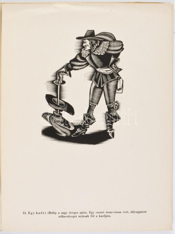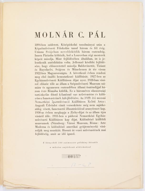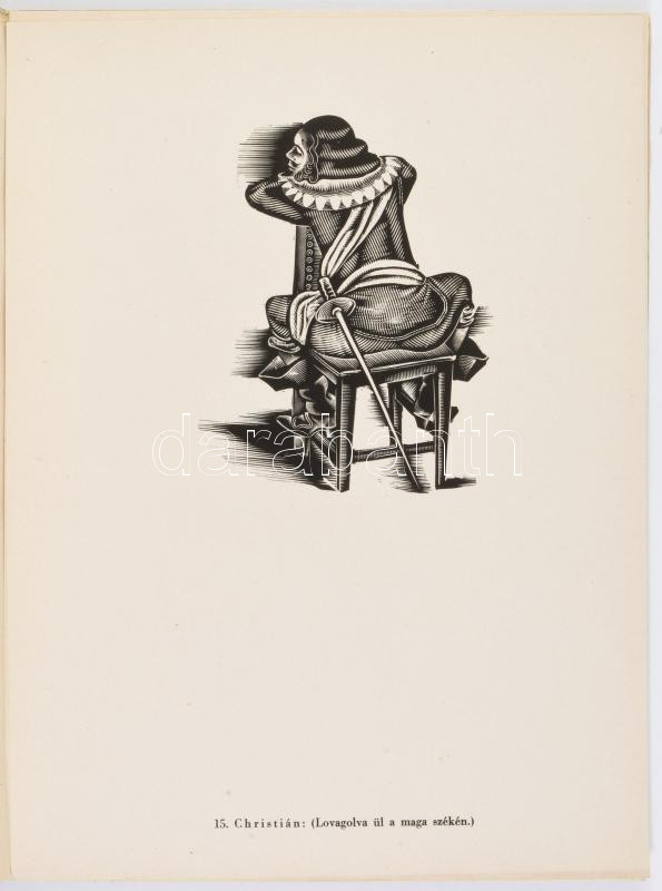 Molnár C. Pál: Cyrano de Bergerac. Magyar Grafikusok Könyvei. V. Bp., [1944], Szépmíves Műhely,(Kiss János-ny.), 2 sztl. lev. + 1+29 (fametszetek) t. Számozott (442./500), a művész, Molnár C. Pál (1894-1981) által ALÁÍRT példány. Kiadói papírmappában, szakadt, kissé kopott mappával, a mappa hátsó borítóján gyűrődéssel, az 1. sztl. levélen kis szakadással, kis gyűrődéssel.