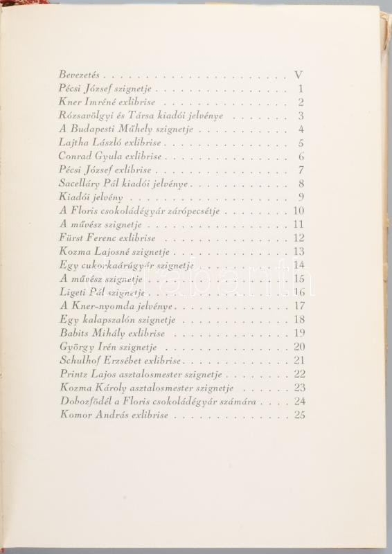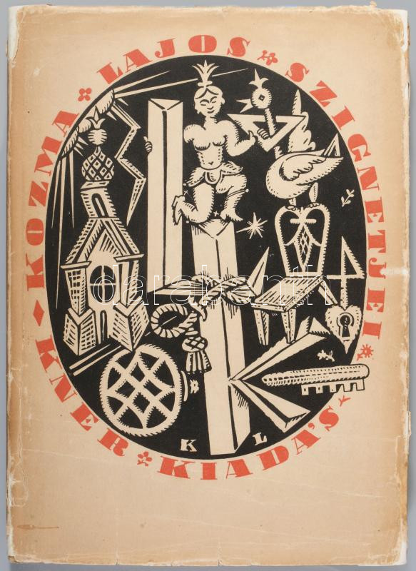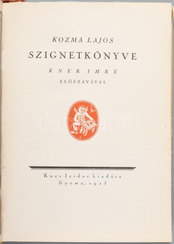Kozma Lajos: - - szignetkönyve. Kner Imre előszavával. Gyoma, 1925, Kner Izidor, XVIII+2 p.+50 t. Első kiadás. Megjelent 400 példányban. Az elülső szennylapon Kozma Lajos beragasztott linómetszetével, 16,5x11,5 cm. Kiadói félvászon kötésben, az első kötéstáblán Kozma Lajos fekete nyomású szignetjével, kiadói Kozma Lajos által illusztrált papír védőborítóban, javított, sérült borítóval.