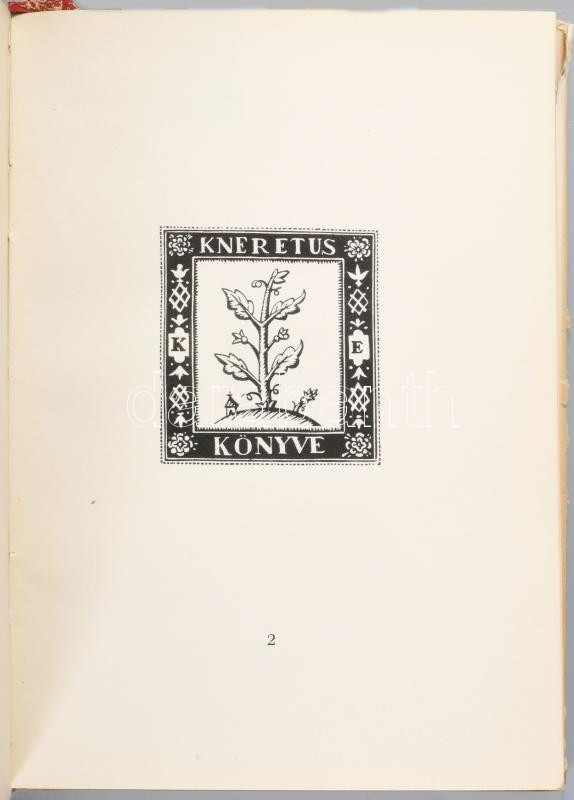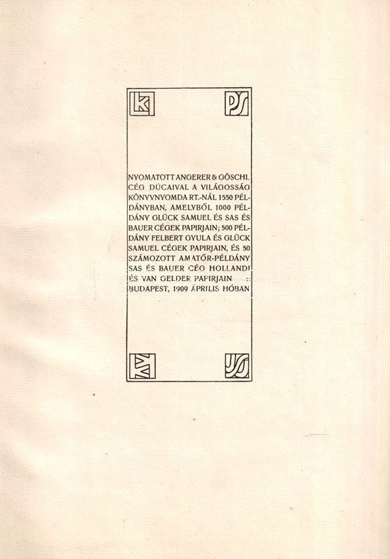 Kiadói, a kötéstáblák szélein enyhén kopott, gerincén Kozma Lajos szecessziós rajzával illusztrált félpergamen kötésben, az első kötéstáblába nyomott, szintén az illusztrátor által rajzolt, vaknyomású ovális könyvdísszel. Körülvágatlan, szép példány.