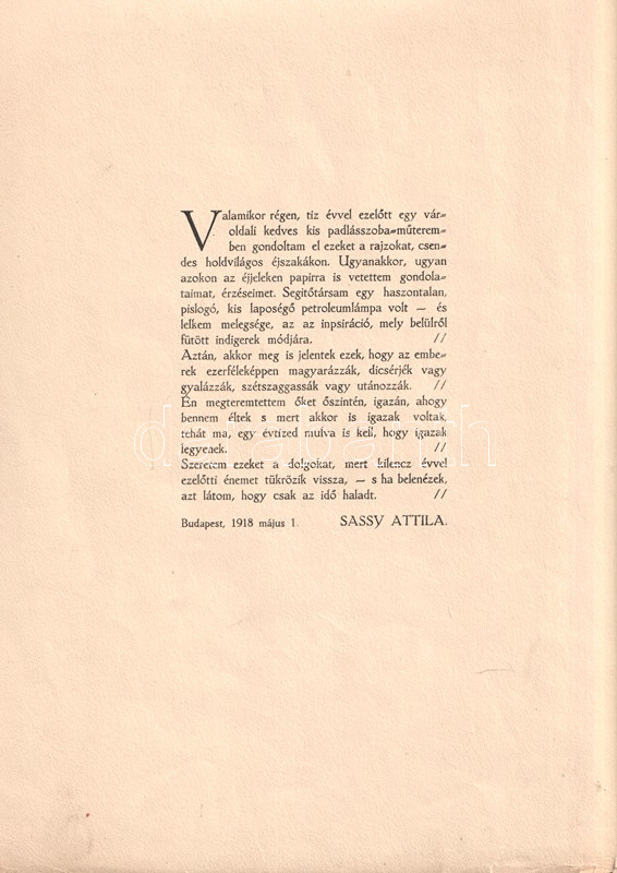 Második kiadás, példányunkból 3 tábla hiányzik. A mappa így Sassy hat fekete-fehér metszetét, valamint az alkotóművész bevezetőjét tartalmazza. Nyomtatta a Pápai Ernő Műintézete, Budapesten.