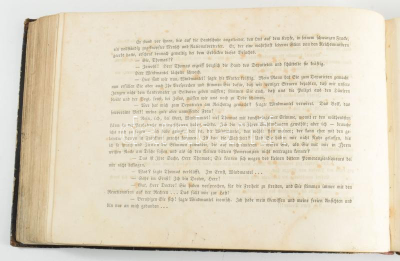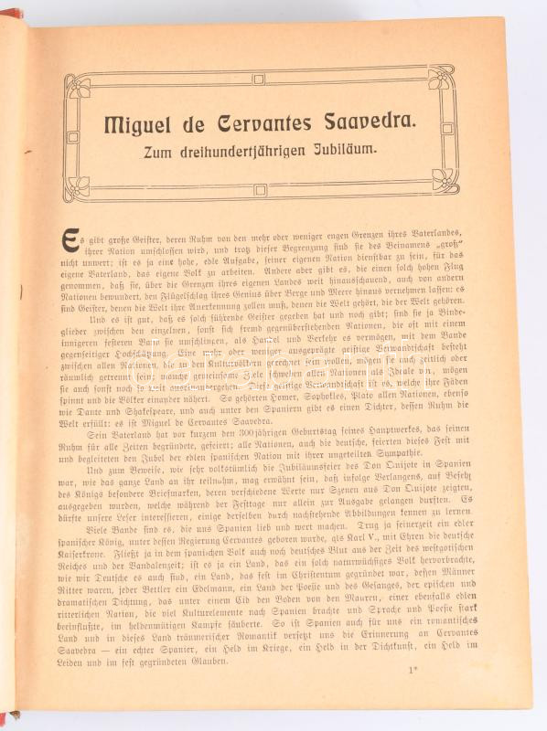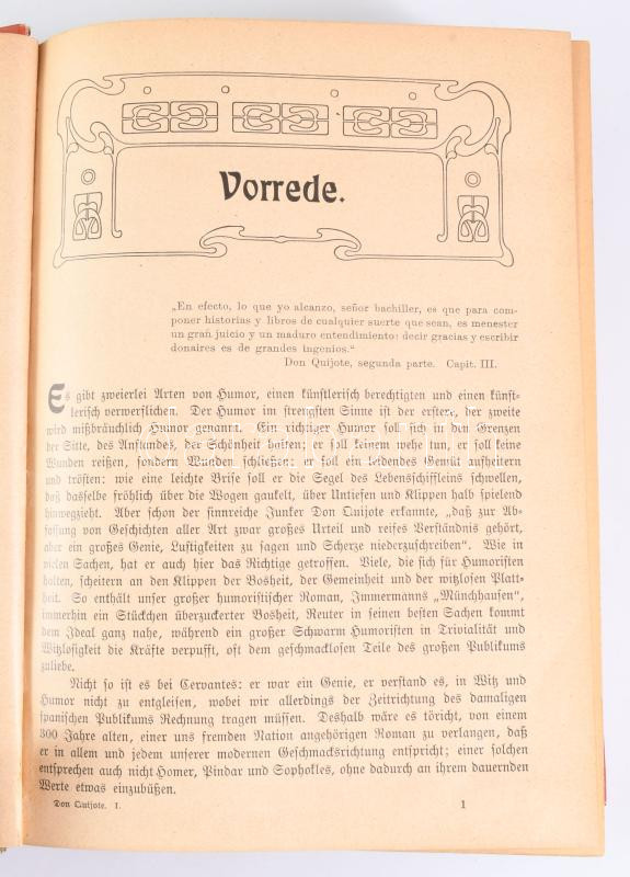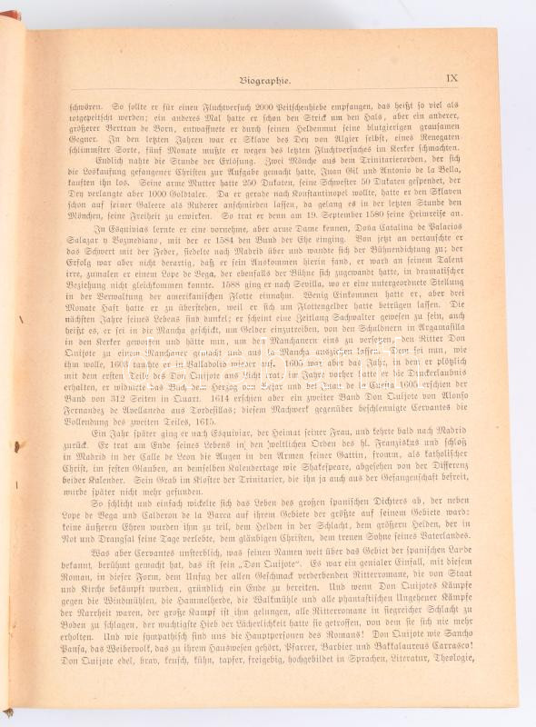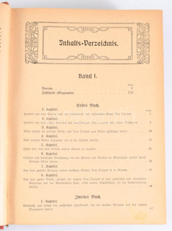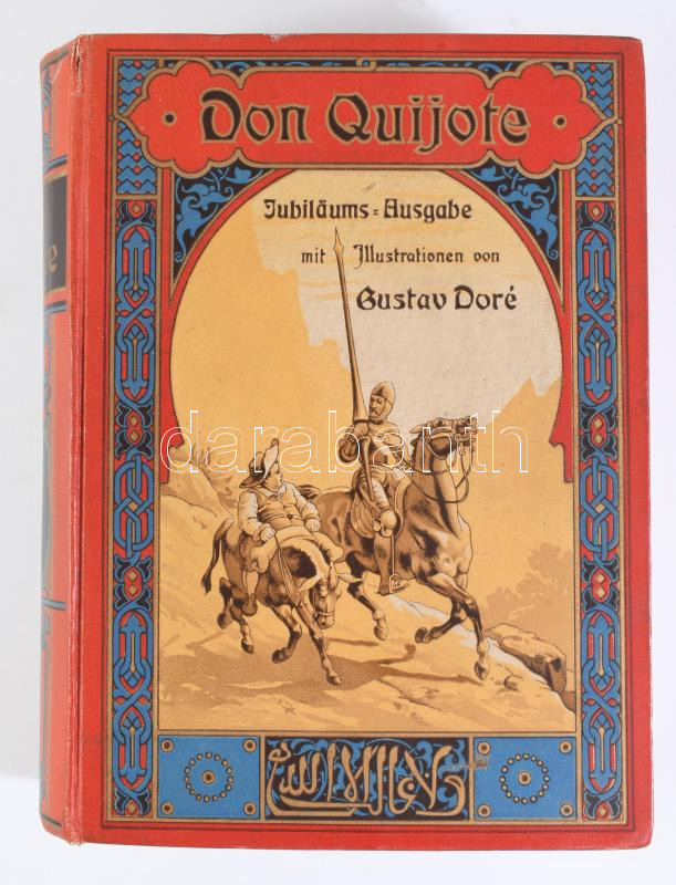 Leben und Taten des scharffinngen Edlen Don Quijote von Mancha von Miguel Cervantes Saavedra I-II. Jubiläums-Pracht-Ausgabe. Berlin, Verlagsdurckerei. 348+420p. Kiadói festett, aranyozott egészvászon kötés, gerinc sérült, festett lapélek, kopottas állapotban.