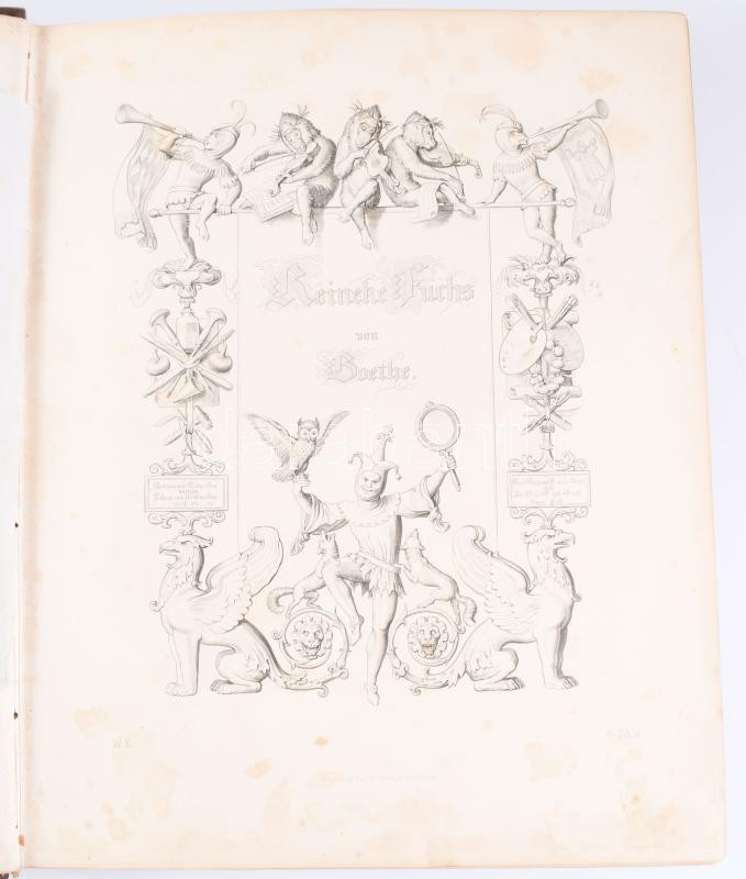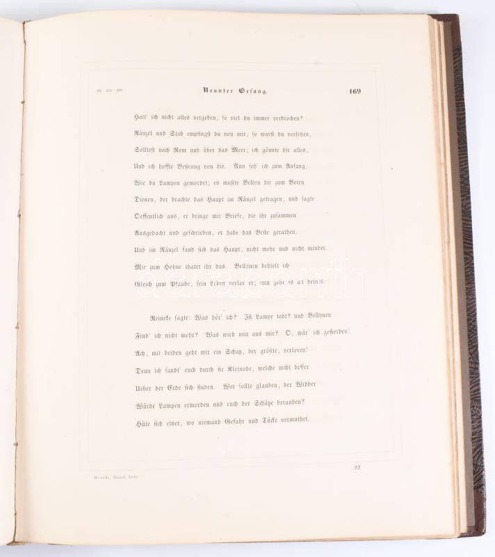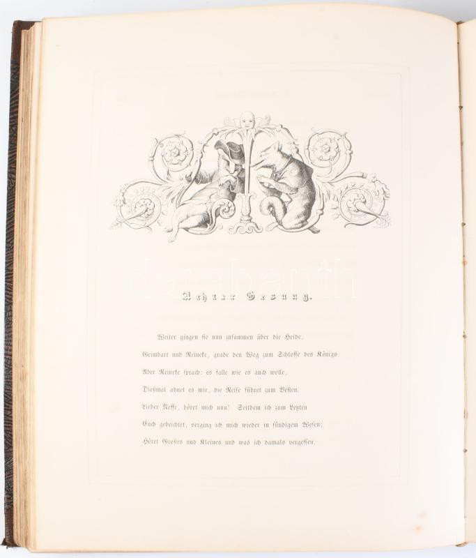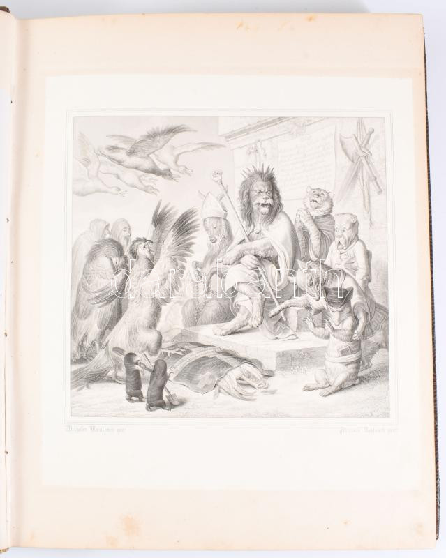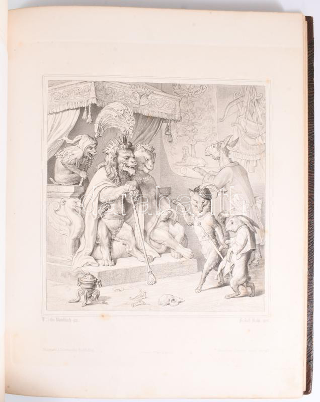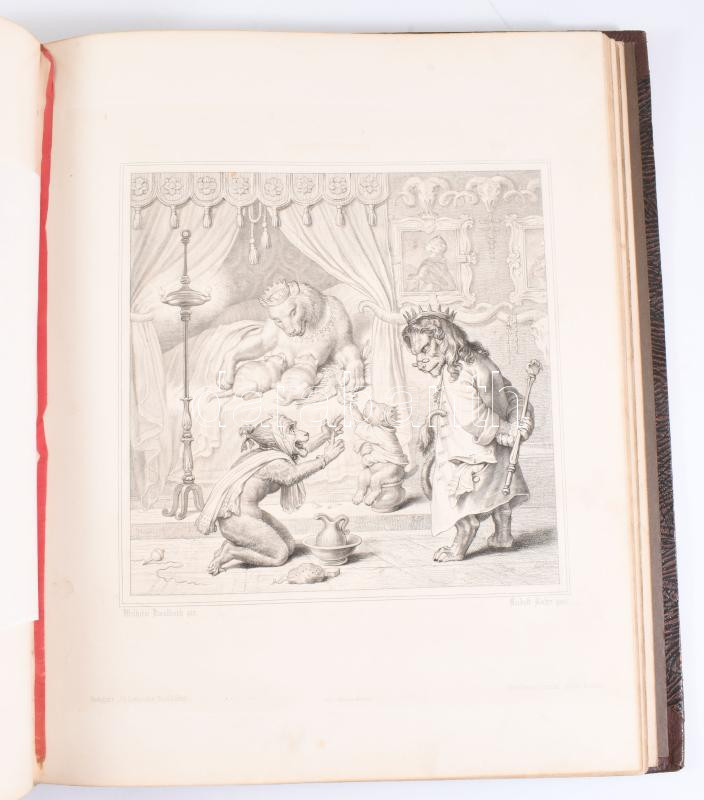 Goethe, Johann Wolfgang von,- Reineke Fuchs von Wolfgang von Goethe mit Zeichnungen von Wilhelm von Kaulbach, gestochen von R. Rahn und A. Schleich. München, 1846. Verlag der Literarisch-artistischen Anstalt,, 257 p. 35 acélmetszetű tábla. Aranyozott korabeli félbőr kötésben / With 35 steel plate engravings, in conteporary half leather binding.