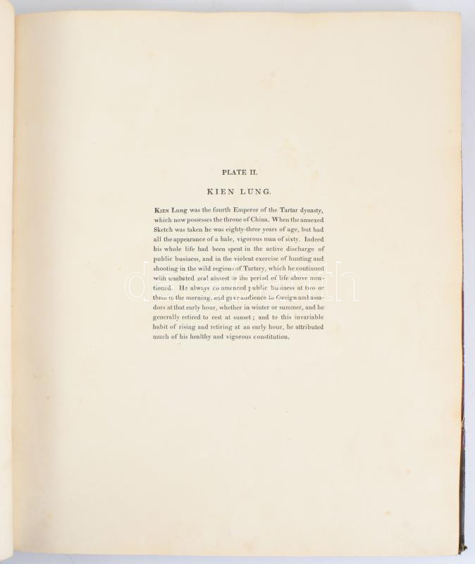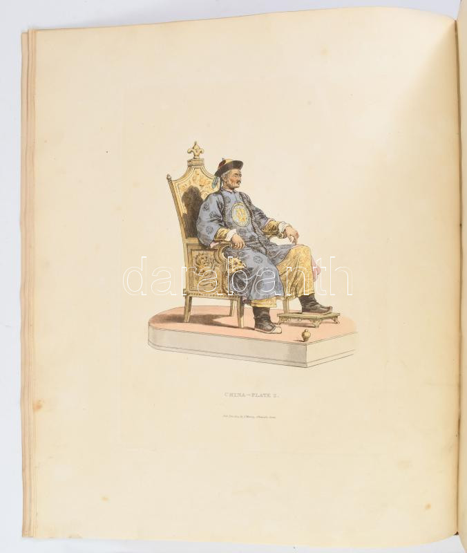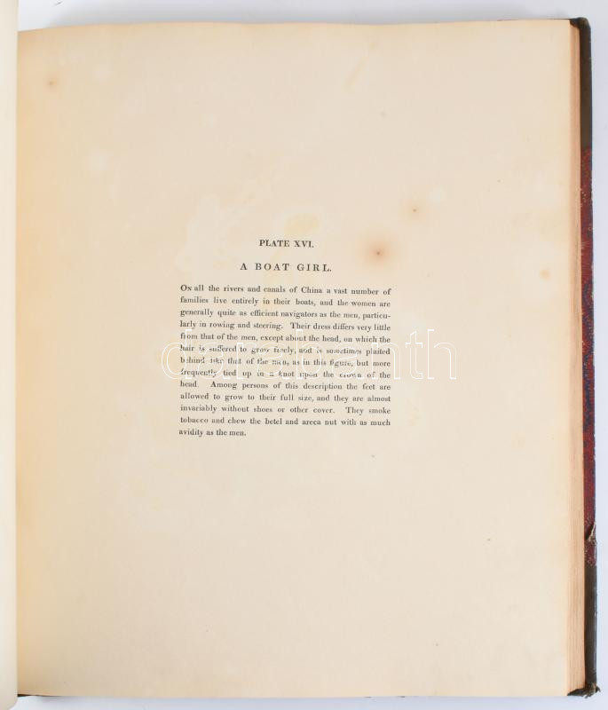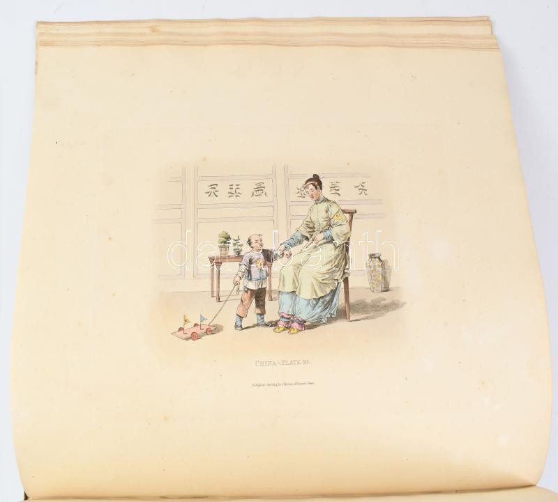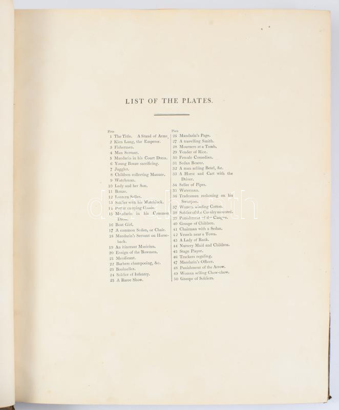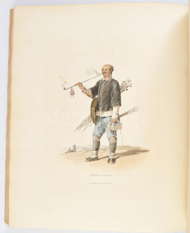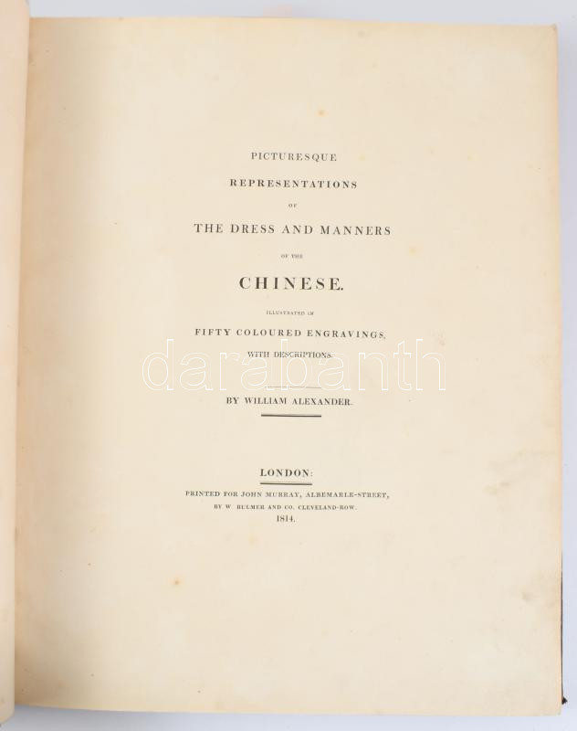 Alexander, William: Picturesque representations of the dress and manners of the Chinese. Illustrated in fifty coloured engravings. With descriptions. London, 1814. John Murray, London. 104 p + 50 kézzel színezett litografált táblával illusztrált. Maroquin félbőr kötésben, ez első borító leszakadt.