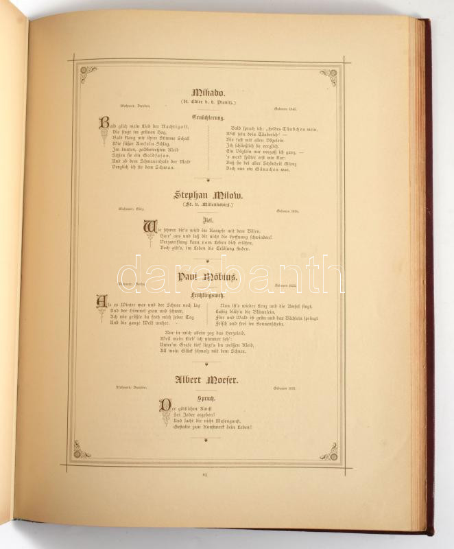 Hinrichsen, Adolf: Das Deutsche Schriftsteller-Album. Herausgegeben unter Mitwirkung Ernst von Wildenbruchs von Adolf Hinrichsen. Berlin und Leipzig, 1885 Wilhelm Friedrich,,1 t 139p. 15t. Dúsan aranyozott egészbőr kötésben, aranyozott lapélekkel, szép állapotban