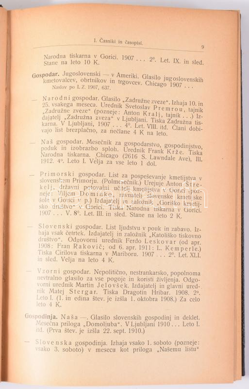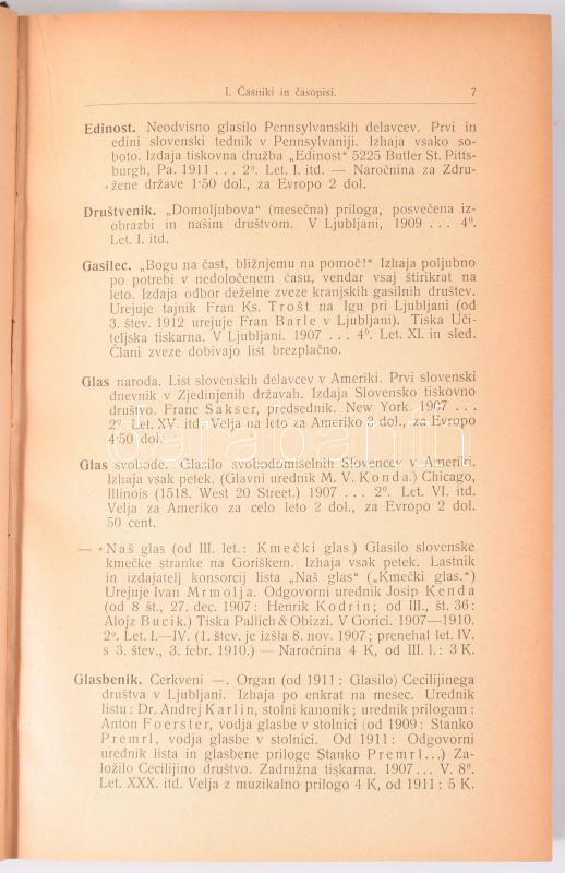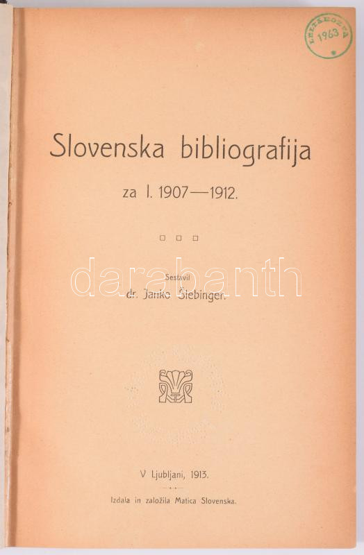 Slovenska Bibliografija za L. 1907-1912. Sestavil dr. Janko Slebinger. 336 p. + K. Glaser: Slovensko knjistvo od 1 januarja do 31 decembra. Bibliografija Slovenska 225 p. Aranyozott félvászon kötésben