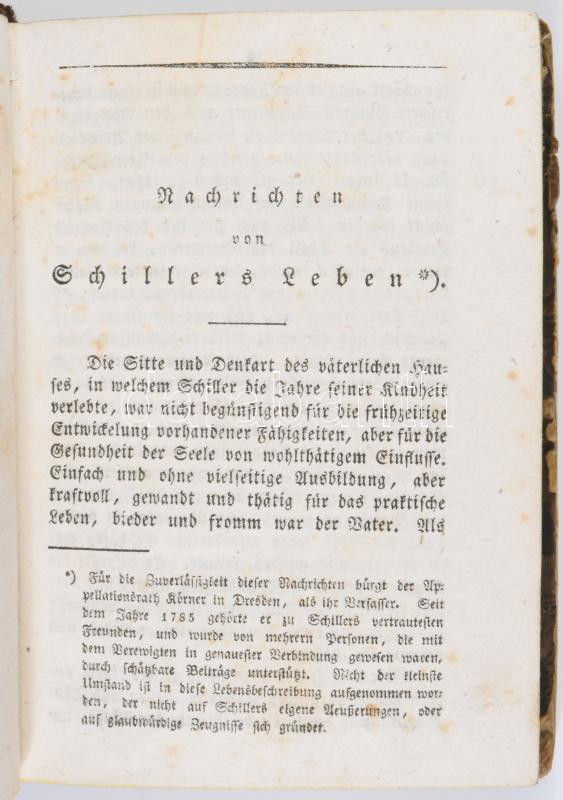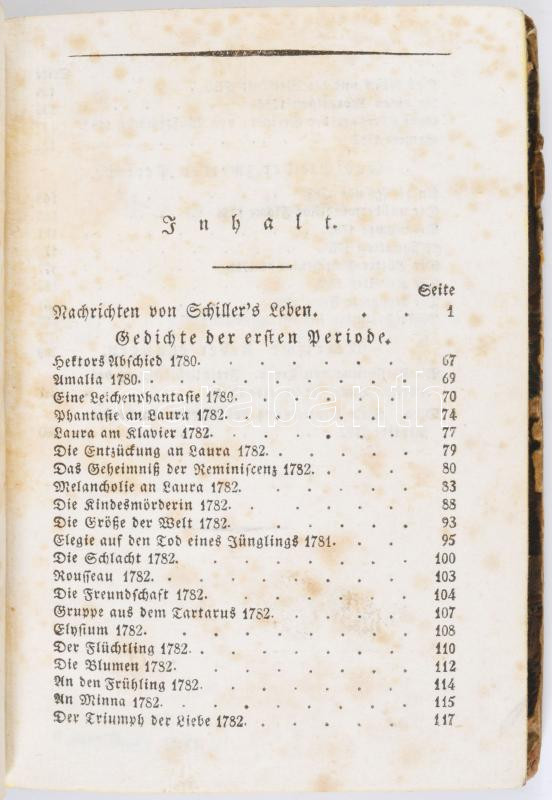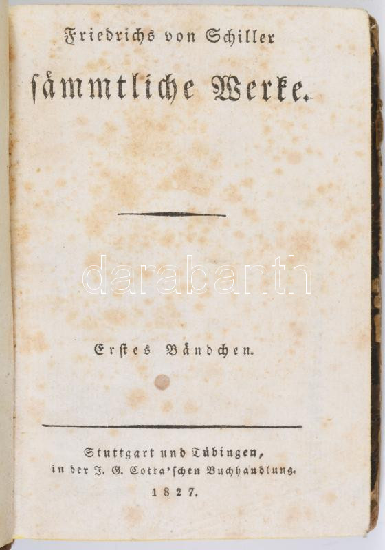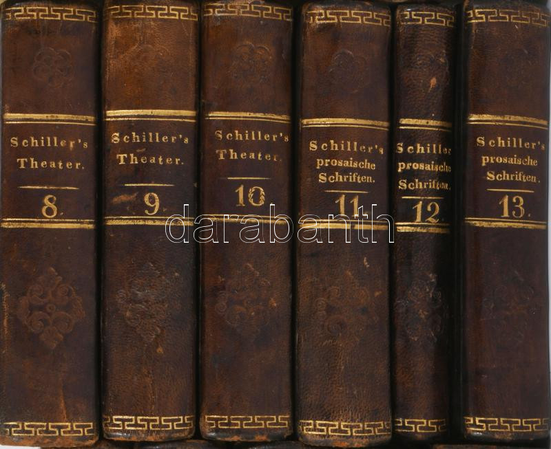 Schiller, Friedrich von, Sämmtliche Werke. Stuttgart und Tübingen, J. G. Cotta'sche Buchhandlung, 1827-1828, 1-18. kötet (Teljes.) 302, 304, 412, 327, 376, 441, 410, 336, 378, 345, 394, 248, 339, 293, 340, 396, 386, 497 p. Korabeli, aranyozott félbőr kötésben, szép állapotban / Complete series. In half leather binding