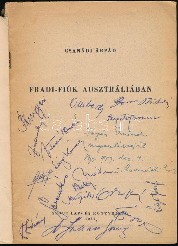 Csanádi Árpád: Fradi-fiúk Ausztráliában. A szerző, Csanádi Árpád (1923-1983) labdarúgó, edző, sportvezető, sportdiplomata, címzetes egyetemi tanár által DEDIKÁLT példány! A turnén résztvevő fradista labdarúgók által ALÁÍRT: Fenyvesi Máté, Friedmanszky Zoltán, Vilezsál Oszkár, Ombódi Imre, Borsos Miklós, Szigeti Ferenc, Gerendás András, Láng Károly, Gulyás Géza, Kertész Tamás, Kispéter Mihály, Mátrai Sándor, Dékány Ferenc és mások, összesen 17 aláírással! 1957, Sport Lap- és Könyvkiadó. Kiadói tűzött papírkötés, sérült gerinc, kopottas állapotban.