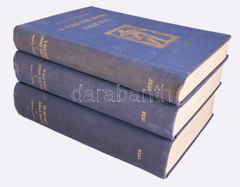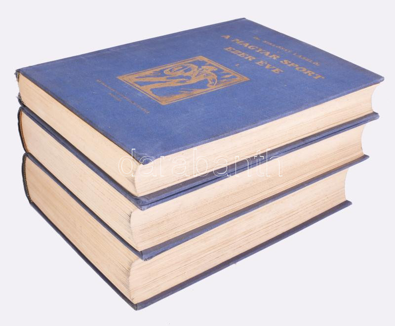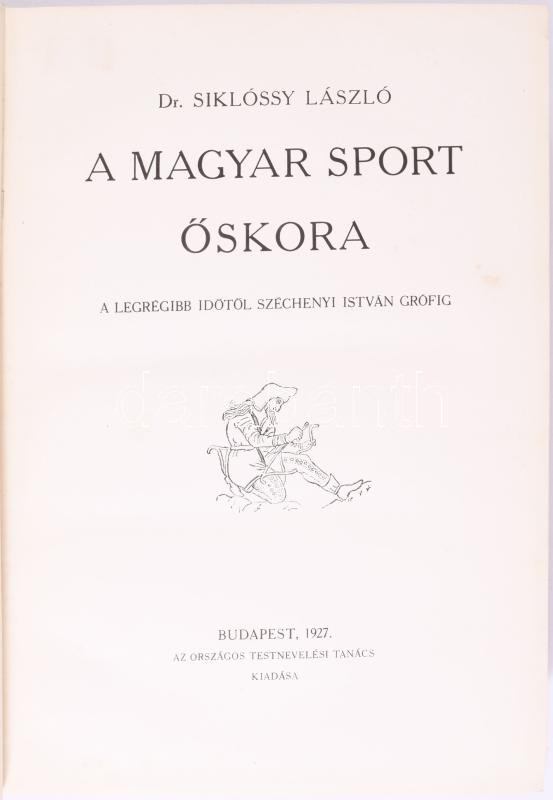 Siklóssy László: A magyar sport ezer éve. I-III. kötet. I.: A magyar sport őskora. A legrégibb időtől Széchenyi István grófig. II.: Széchenyi-Wesselényi és még egy nemzedék. 1820-1874. III.: A modern sportélet előkészítése. 1875-1896. Bp., 1927-1929, Országos Testnevelési Tanács (Stephaneum-ny.), [6]+446+[2] p.+ 31 t.; 671+[1] p.+ 40 t.; [4]+804+[4] p.+ 62 t. Első kiadás. Szövegközti és egészoldalas képekkel gazdagon illusztrálva. A könyvdíszek Haranghy Jenő festőművész munkái. Kiadói aranyozott egészvászon-kötés, jó állapotban, az I. kötet gerincén kis sérüléssel.