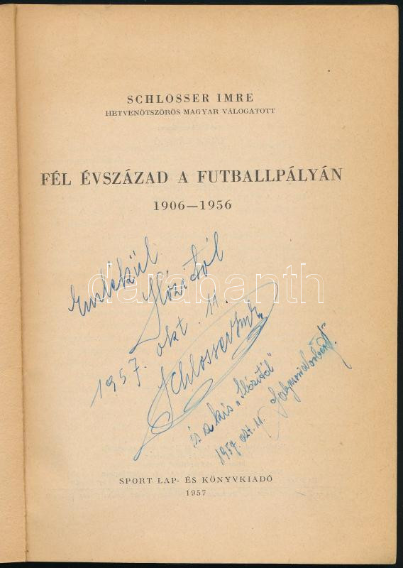 (1889-1959) válogatott magyar labdarúgó, edző és fia, Solymosi Norbert (1920-1980) labdarúgó által DEDIKÁLT, dátumozott (1957. okt. 11.) példány.