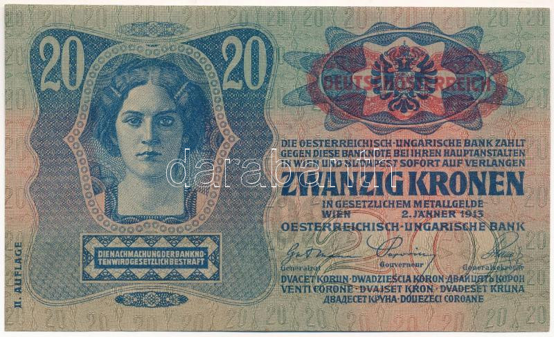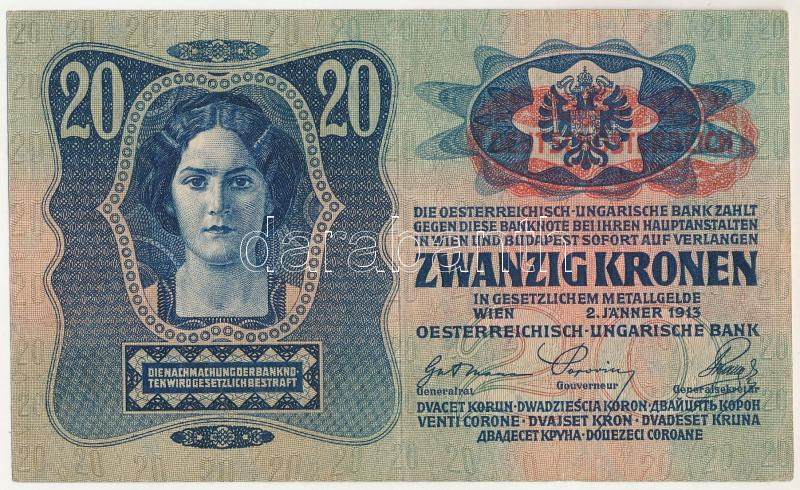 1913. 20K "2284 913217" piros "Deutschösterreich" felülbélyegzéssel T:F szép papír / Hungary 1913. 20 Korona "2284 913217" with red "Deutschösterreich" overprint C:F fine paper