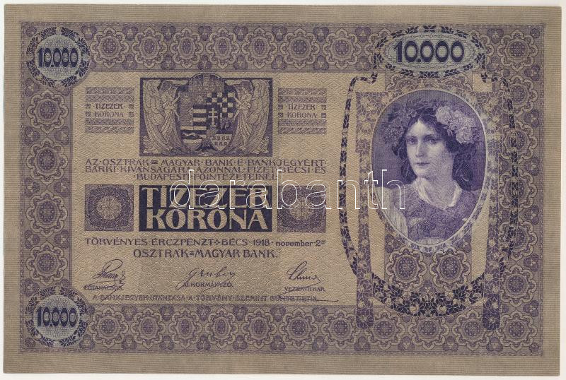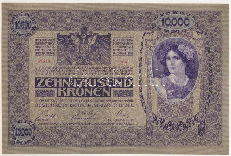 1918. 10.000K "1004 51516" felülbélyegzés nélkül T:UNC,AU ebben a tartásban R! / Hungary 1918. 10.000 Korona "1004 51516" without overprint C:UNC,AU in this condition rare!