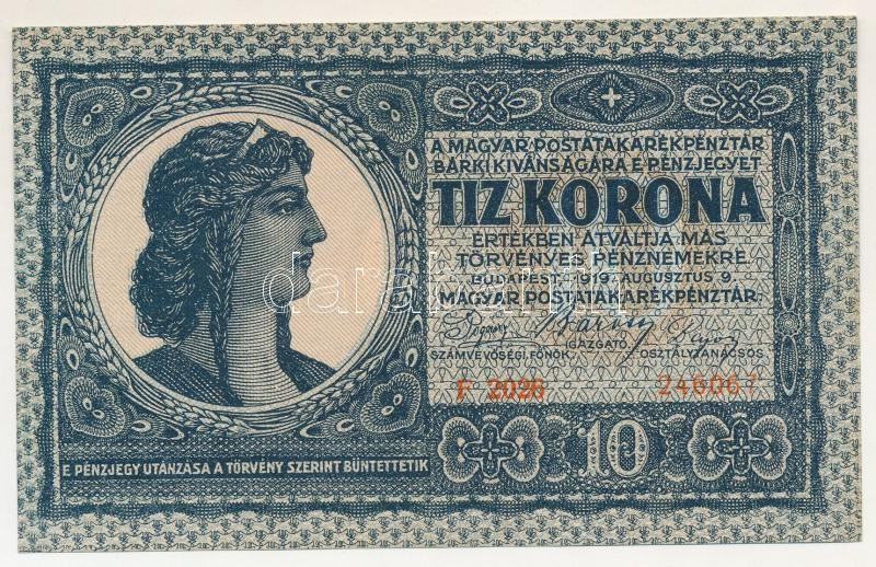 1919. augusztus 9. 10K "F 2026 24607" T:UNC,AU / Hungary 9th August 1919. 10 Korona "F 2026 24607" C:UNC,AU