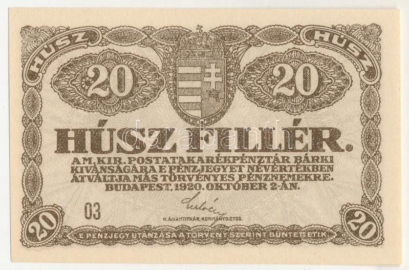 1920. 20f "03" T:UNC / Hungary 1920. 20 Fillér "03" C:UNC