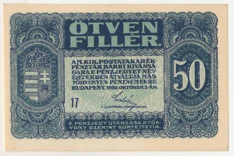 1920. 50f "17" T:AU / Hungary 1920. 50 Fillér "17" C:AU
