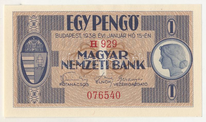 1938. 1P "H 929 076540" T:UNC / Hungary 1938. 1 Pengő "H 929 076540" C:UNC