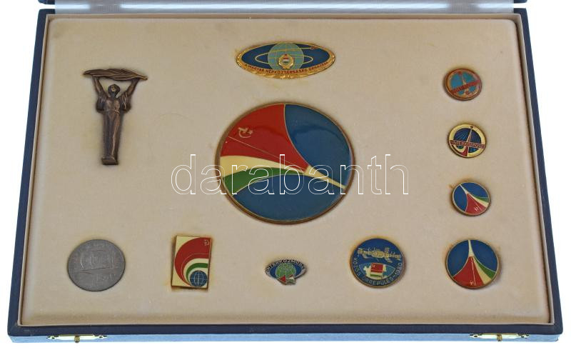 1980. A szovjet-magyar közös űrrepülésre kiadott jelvénysorozat (8xklf) közte "A Magyar Népköztársaság Űrhajósa" aranyozott, műgyantás jelvény + műgyantás plakett (80mm) + Szabadság szobrot ábrázoló miniatűr szobor + 100Ft Ni "Szovjet-magyar közös űrrepülés" együtt eredeti díszdobozban T:AU