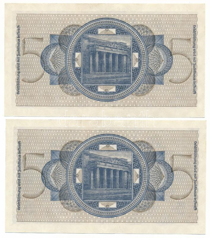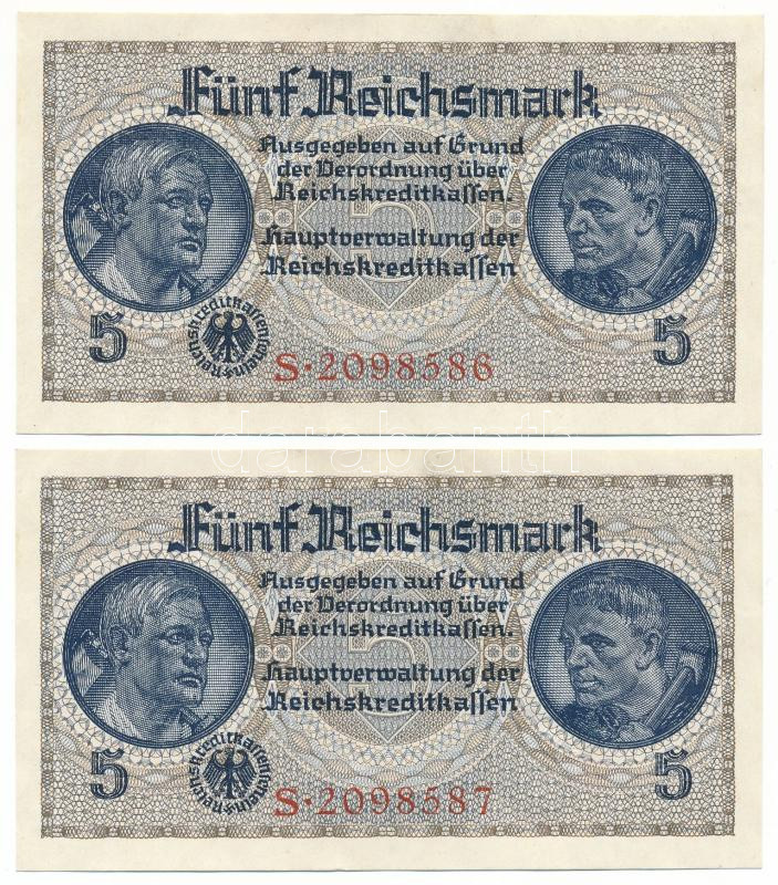 German Third Empire / German Occupied Territories 1940-1945. 5 Reichsmark (2x) consecutive serials "S 2098587 - S 2098586" C:AU
