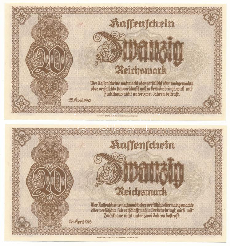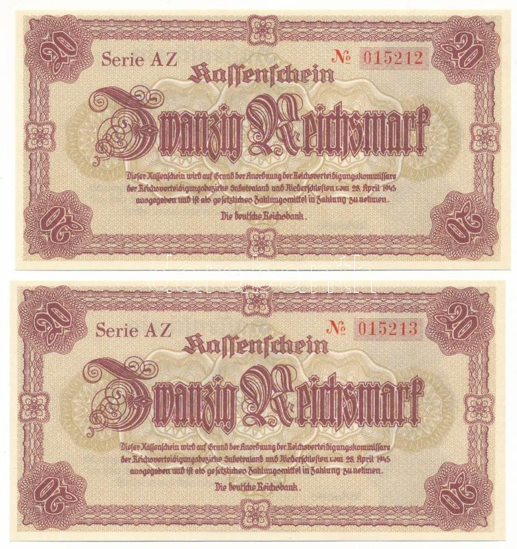 German Third Reich / Sudetenland and Lower Silesia 1945. 20 Reichsmark (2x) consecutive serials "AZ 015212 - 015213" C:UNC