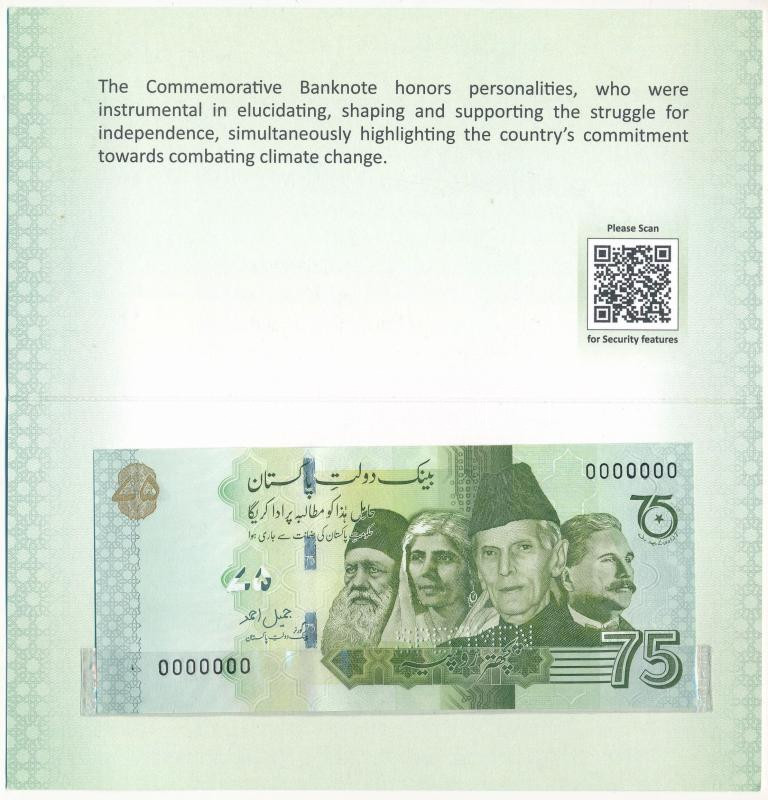 Pakistan 2022(DN) 75 Rupees "75th anniversary of independence" with "0000000" serial number, with "SPECIMEN" perforation in a paper case C:UNC